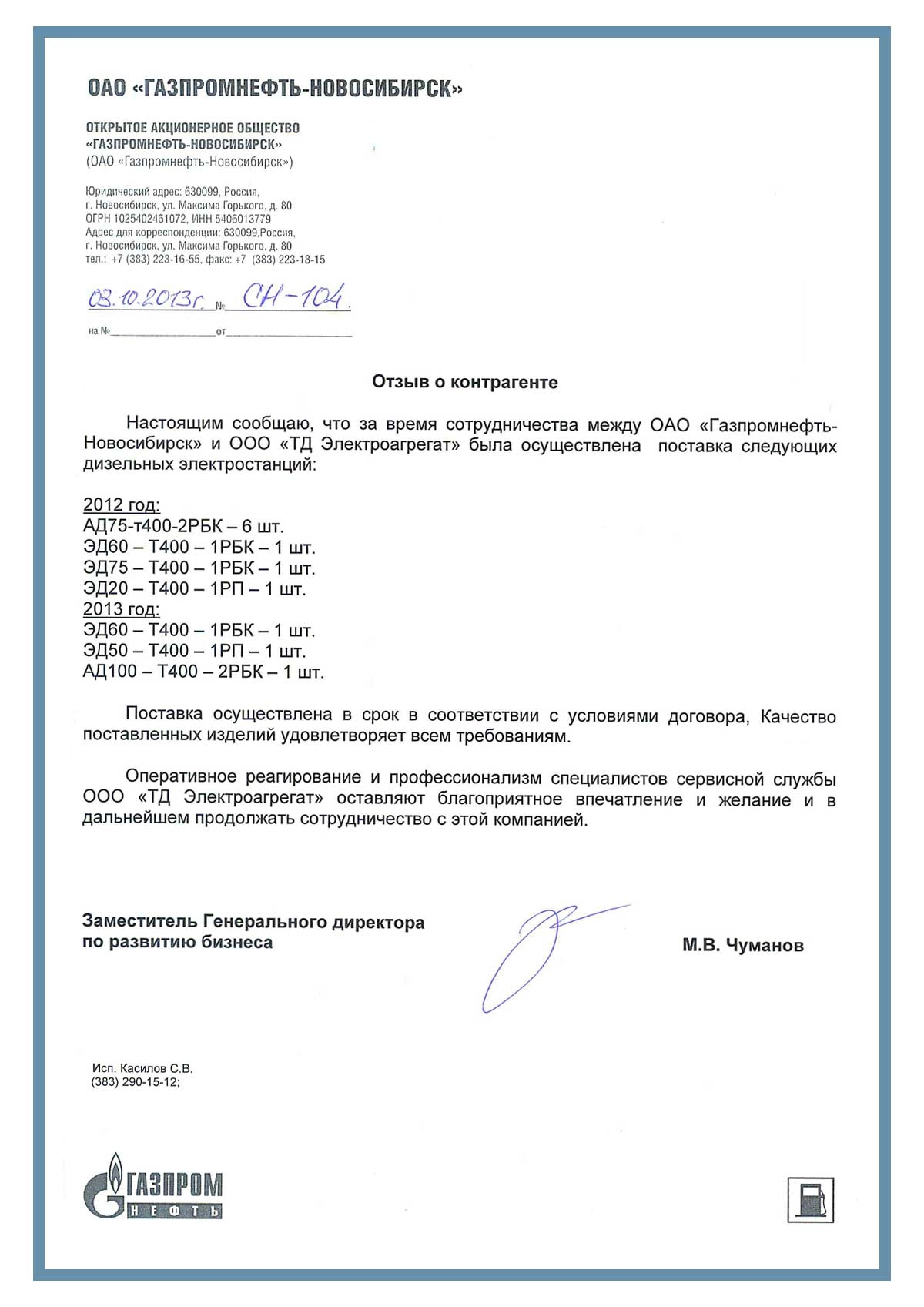 Отзыв контрагентов о компании ООО «ТД Электроагрегат» и  исполненном проекте для ОАО «Газпромнефть - Новосибирск»